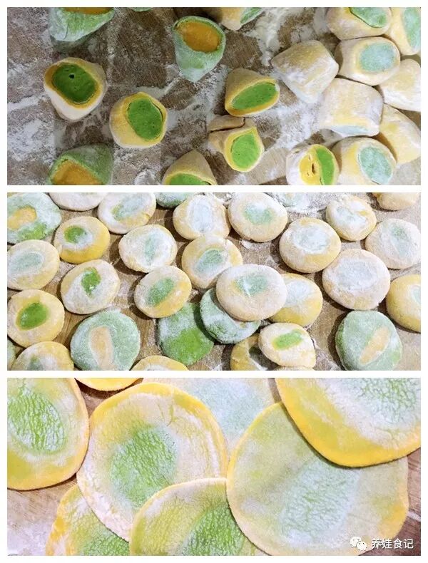 2、把黄绿椭圆面切成小剂子,按扁,擀成饺子皮。