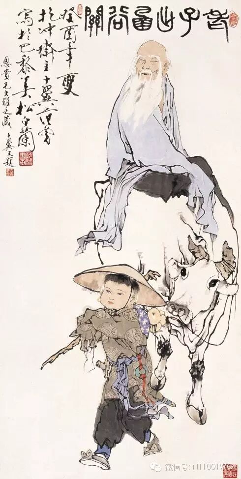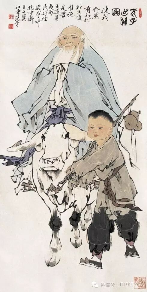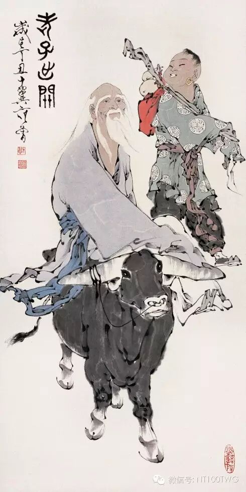 你看那老子何等的和悦,他心灵里了无尘垢,微微地抬着头,微微地笑着,那是历尽人间沧桑、看透治乱兴亡、认清枯荣损益之后大彻大悟者的欣然微笑。他的背稍向前弯,清明在躬,那是博大者的虚怀。童子憨而且朴,稚气和浑厚,成了他充满活力的生命特征,他紧随着老子,或者说老子紧贴着他,甚至可以说,老子和童子合二为一。