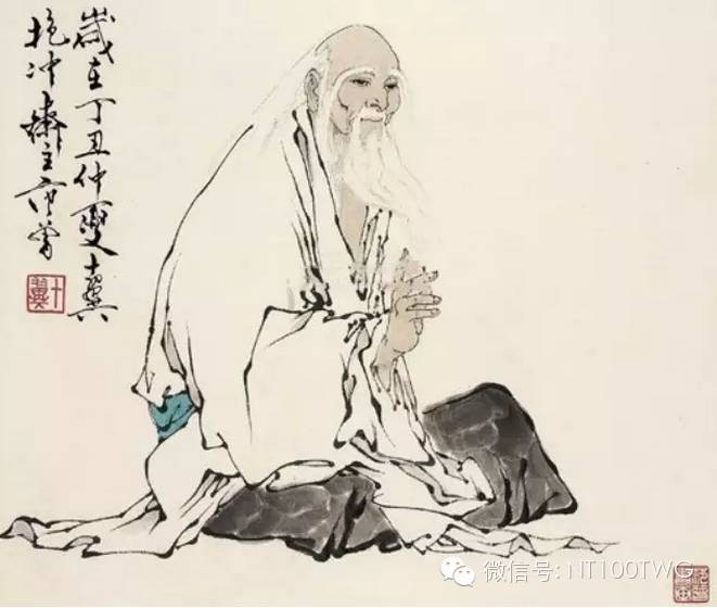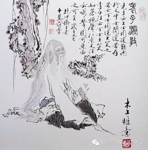 我喜欢画老子,画他的说法演教,画他的闭目神思,画他的骑牛出关,而旁边总有一个稚拙无邪的村童作他的书仆,背着他的几卷《道德经》和饮水的葫芦。老子则素衣布鞋,须眉皓如积雪,而头发披散,不着巾帻,有飘飘欲仙、不与世争的风神。他微微地欠着腰,半睁半闭着那双洞察天地古今的慧目,寂然凝虑,悄焉动容。那童子不正是对老子永怀敬意的范曾我吗?在老子面前,我心灵上有一种无法言状的感动,我笔下那霜雪似的毛发,正昭示着皑皑千山般明净高远的学识,那止水般的宁静,也象征着老子澄潭千尺、清澈幽深的思维。