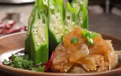 5、将海蜇与秋葵摆在盘中,淋上酱汁即可。