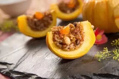 3、把炒好八宝米装入南瓜内,要压的严实点,然后用保鲜膜包好、入蒸箱蒸制50分钟即可。