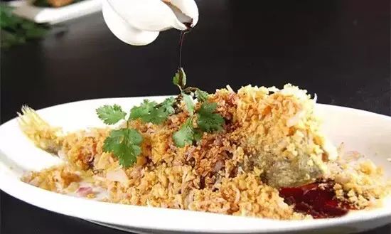4、将蒜米、干葱米下油锅炸至干香,捞出来盖在大黄鱼的表面,端上桌后才将煮热的豉油糖汁淋在鱼身上。