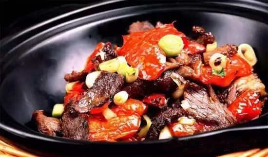 3、锅入油烧热,下蒜片和姜片爆香后,放入大红椒块翻炒至外皮起泡时,下入雪花牛肉并淋入小炒汁,调入鸡精和味精,炒香后即可装进烧热的砂锅里上桌。