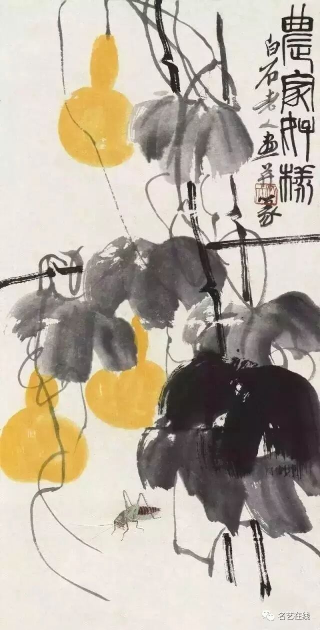 齐白石对吴昌硕极为推崇,而他也喜欢画葫芦,一生画葫芦几十年,一直画到生命的最后阶段,并且越至晚年笔墨越率性。有时画长在架上的葫芦,有时画摘下来的葫芦,全用没骨法——以水墨画叶,以藤黄画果,不论怎样画,齐老的葫芦都满溢着生活情趣。
