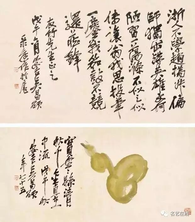 上面这幅齐老93岁所作葫芦小幅,两只青、黄葫芦正方置于画中,色墨淋漓,灿烂而热烈。