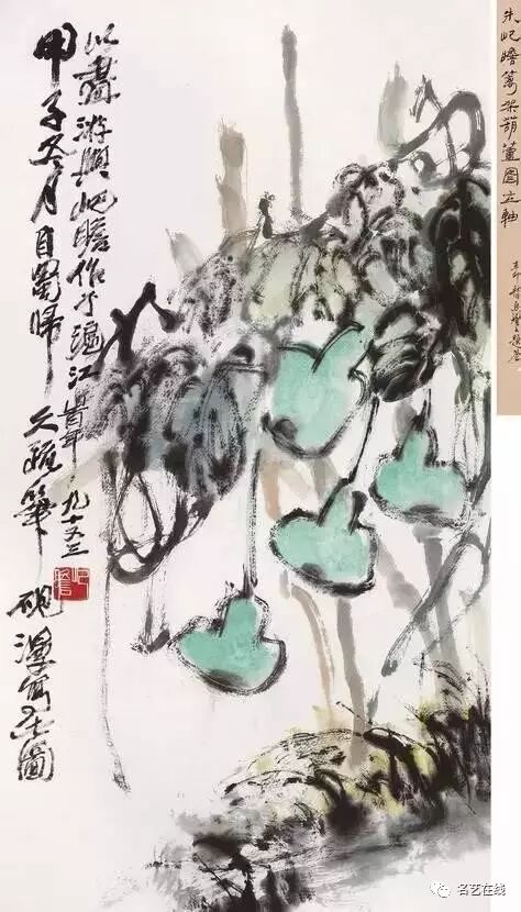 吴昌硕喜欢以泼墨写叶,浓墨勾叶筋,淡墨写葫芦,使得整幅画显得生意盎然。