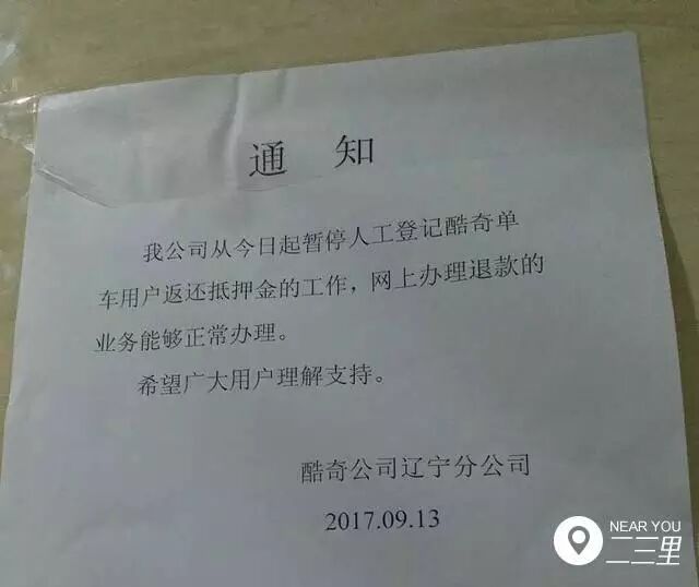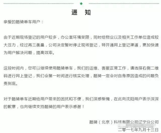 通知:从今天开始,沈阳酷骑暂停人工登记工作。不再接待到酷骑公司进行现场登记的用户,用户只能网上办理退款。