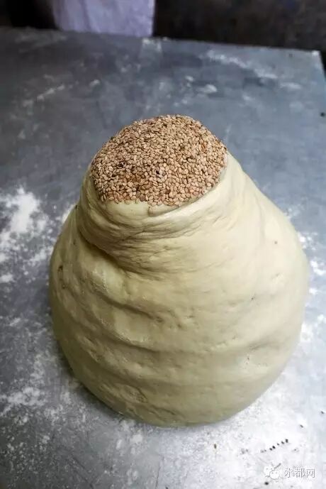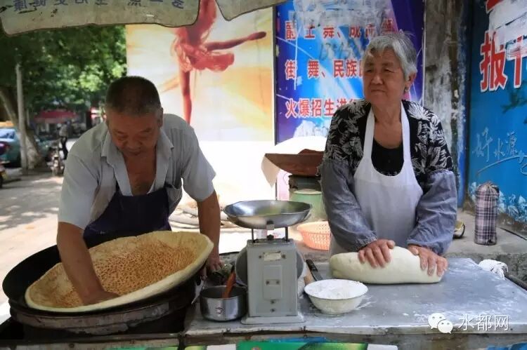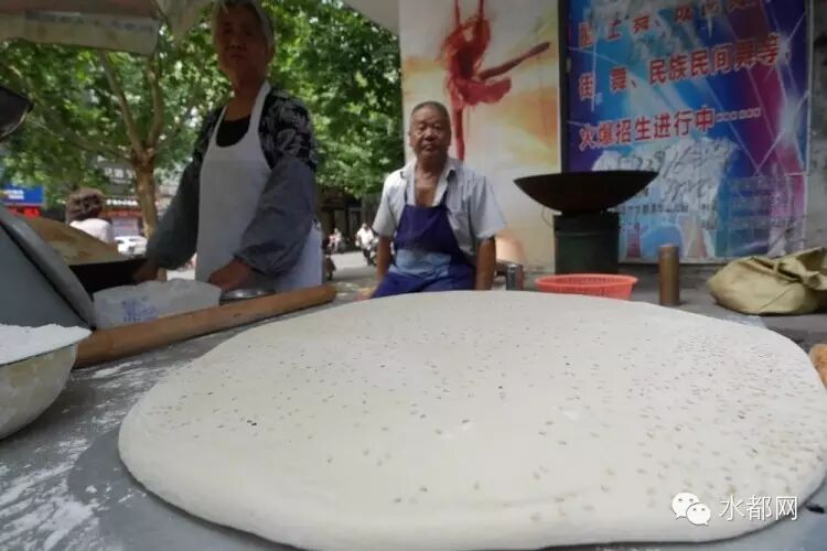 老杨的锅盔馍摊位 位于老广场对面均州一路路口,一把遮阳伞,一口铁锅,一块案板就是老俩口的家什,每天下午2点过点就出摊,杨师傅与老伴今年已经过了70岁了,身体依然硬朗,这也是每天劳动的结果吧,我们拍下了做锅盔馍的整个过程,先是揉面,蘸芝麻,再擀面,特别是擀面这道工序,擀不好的话,芝麻就会扎堆,不能均匀的铺在面饼上,杨师傅说很多做小吃的老板都都向他请教过擀面的技巧,面擀好后就贴锅了,先是讲面饼不停的翻折,出现云状花纹后,再刷一层油,继续贴锅,这时候还要用手不停的锤打,拍压,这样贴锅的一面就会出现漂亮的金黄色花纹,然后再反扣在锅中继续烤蒸,这时候面饼就中心隆起,就像一顶帽子,上面密布的花纹如同战士的盔甲,这也就是锅盔馍叫法的来历吧,一般一个锅盔馍从入锅到起锅,至少是半个小时,等到两面都变得金黄后,再用竹签扎眼排气,这样能使馍受热均匀,不至于成死面一坨,最后一面金黄香脆,外焦里嫩,舒松可口的锅盔馍就做好了。