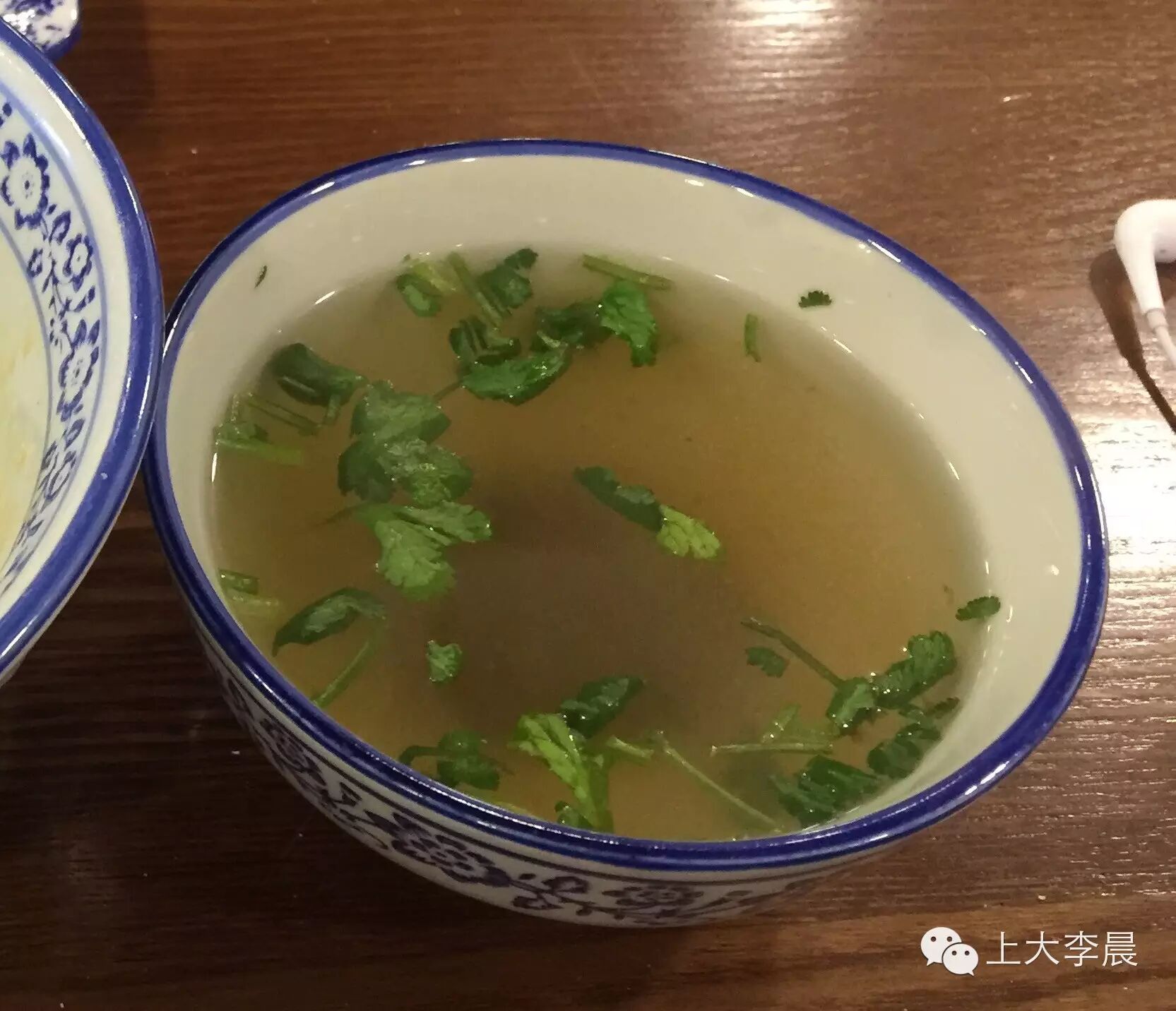吃完了,通常伙计就会上一小碗清汤。如果没上,就要自己喊一嗓子:“来碗汤!”伙计就会端上一小碗清汤。