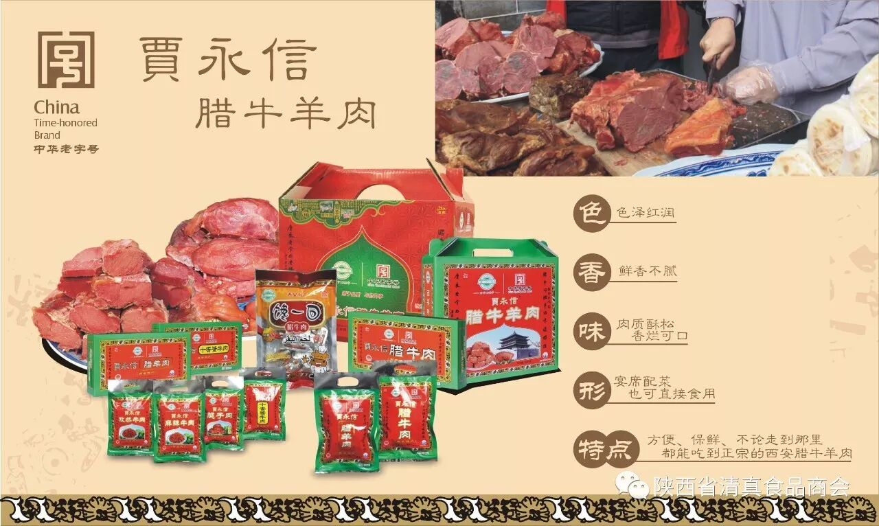 始于1928年,中华老字号—陕西省非物质文化遗产,贾永信 腊牛羊肉 。 “贾永信”腊牛羊肉更是独树一帜,独领风骚。在西安,一提到腊牛羊肉,人们就会想到“贾永信”。“ 贾永信”腊牛羊肉,名声响,牌子亮,可谓家喻户晓。