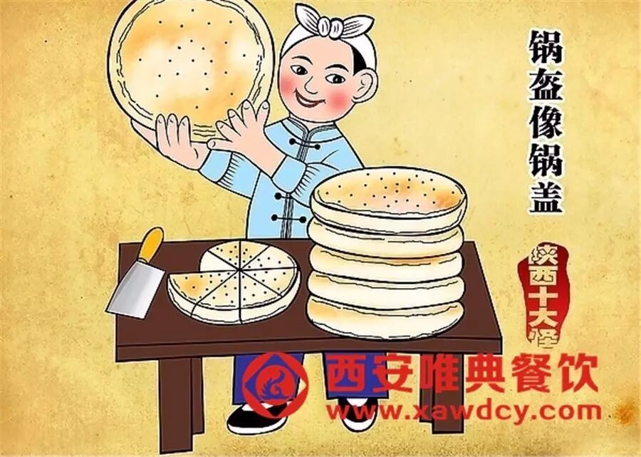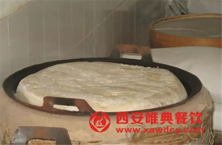 在陕西关中地区,烙制锅盔用的锅可不是一般的小锅,而是用来做十几人饭菜的大锅。这样的锅直径约在七八十公分,而且这样的锅上面用的锅盖也是隆起的,所以说烙好的锅盔就象锅盖一般大小,一般模样。 锅盔制作工艺精细,素以“干、酥、白、香”著称西府。