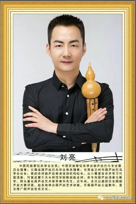 刘亮:中国民族管弦乐学会会员;中国民族管弦乐学会葫芦丝巴乌专业委员会理事;云南省葫芦丝巴乌学会常务理事;甘肃省兰州市葫芦丝巴乌学会会长;秦韵乐坊葫芦丝教育连锁机构校长。从小喜爱音乐并学习竹笛演奏,竹笛启蒙于天水师范学院靳振彪老师。后专攻葫芦丝演奏与教学,师从著名葫芦丝艺术家李春华先生。近年来,多次应邀担任全国葫芦丝大赛评委,赴各地举办葫芦丝艺术讲座,开展葫芦丝公益教学,普及推广葫芦丝音乐文化。