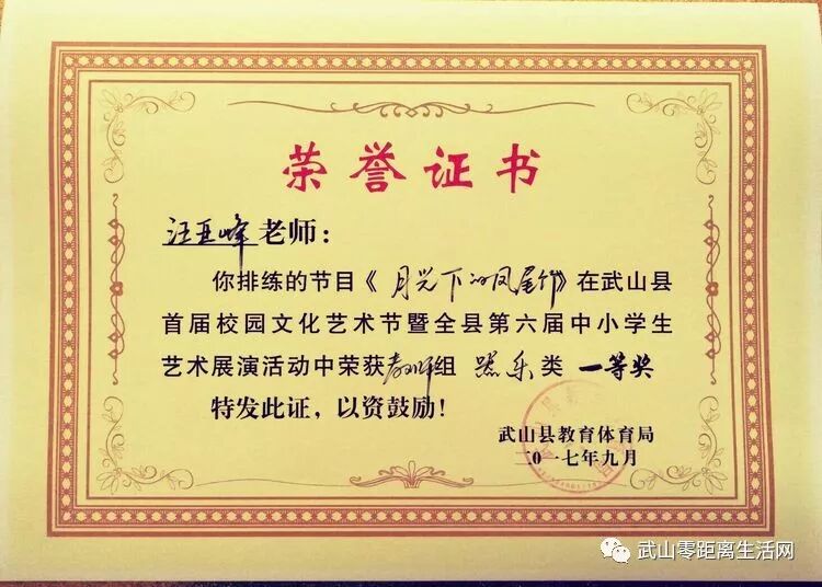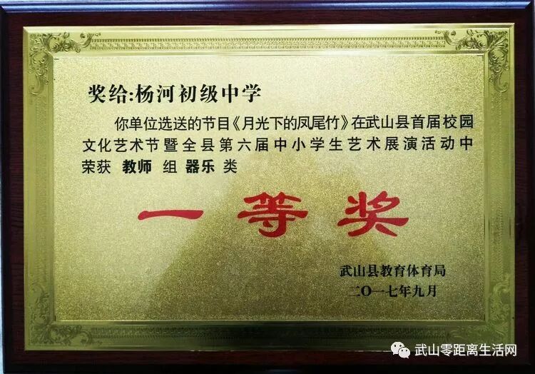 组织学校教师排练的节目《月光下的凤尾竹》在首届武山县艺术展演中荣获教师器乐类一等奖。