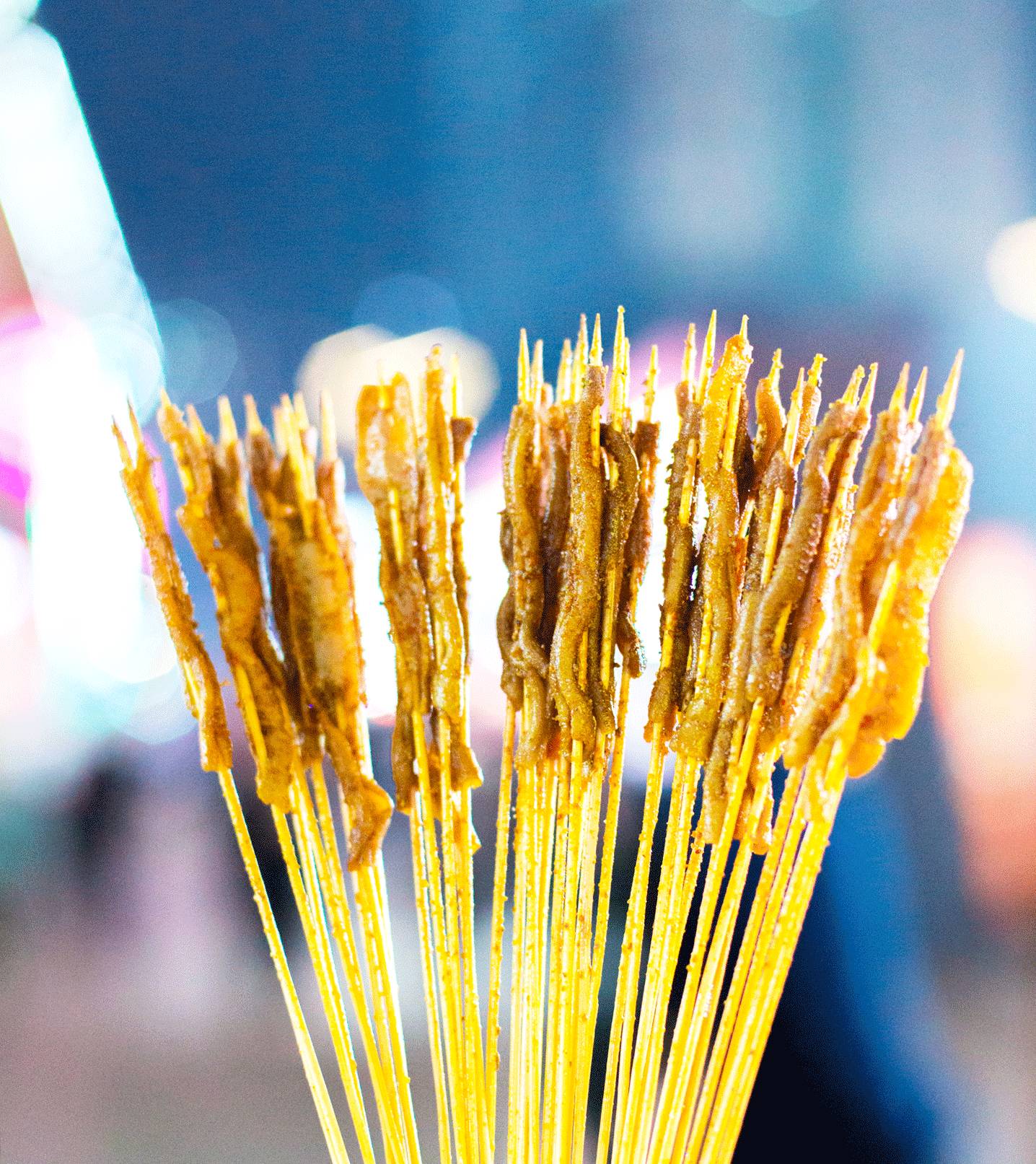 处理的蛮干净的没有什么异味,孜然和辣椒包裹上去,油油润润香喷喷。看起来好像没有40串那么多,数数确实一根都不少。边走边吃,总是不知不觉间就没了……