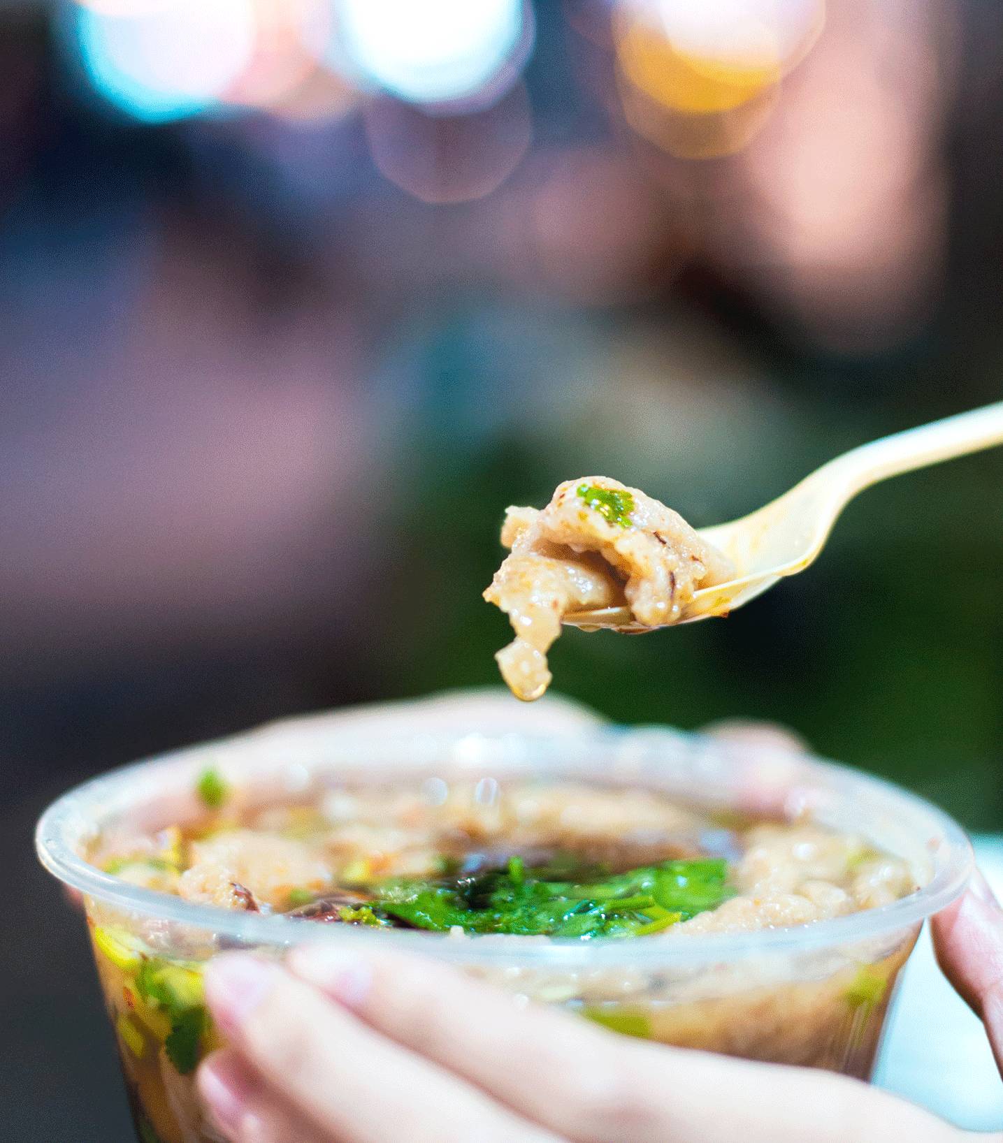 超多人喜欢的这家温州瘦肉丸,每份都是现做的,过程可以说是很有趣了。勺子一推一推的,捶打后的肉糜就进锅准备变成一个个不规则的小肉丸了。