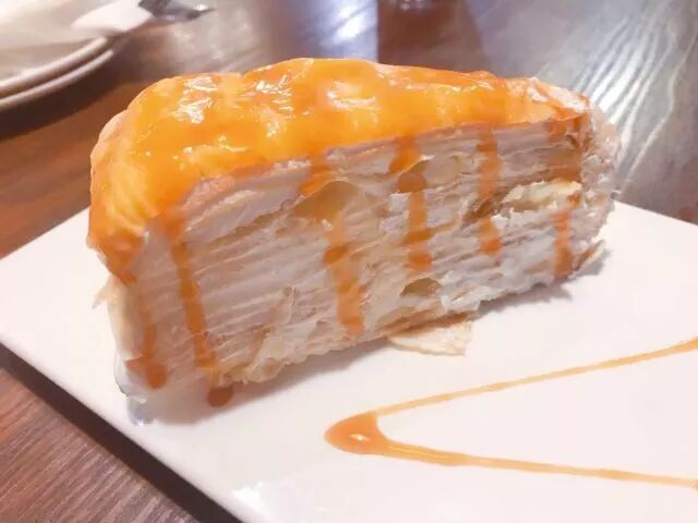 艾乐:榴莲千层很好吃,牛仔骨煎的恰到好处,水果披萨层层果肉甜甜的,最最重要的是驻唱歌手唱的很好听哦,安安静静的吃,安安静静的听歌~