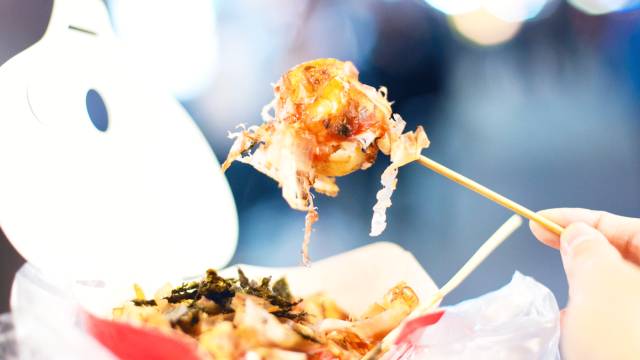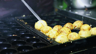 同样的位置,不知是不是换了人,章鱼小丸子的做法变了不少。两年前上面撒的不是海苔碎而是粉,细细碎碎的总让人咬下去嘴边就有一圈胡子,不过戳着小丸子的制作过程一如既往让人看100遍也不厌。