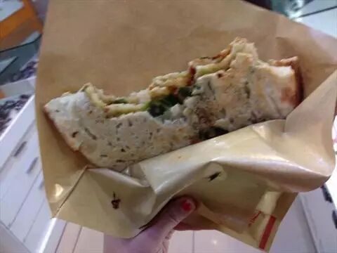 眼睁睁看着前面几位顾客拿走自己的锅盔后,经过一再殷切询问,我的也很快被切好装袋。我迫不及待接过纸袋,热气对着空调凉风腾空而起,冷热交替之下,勾勒回旋引出一阵阵香气。