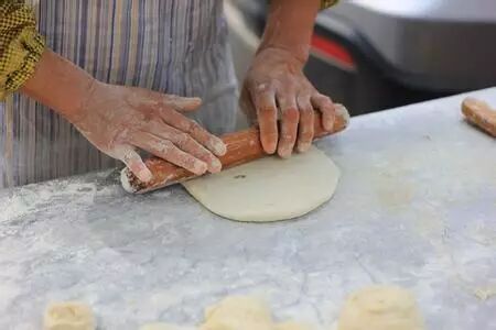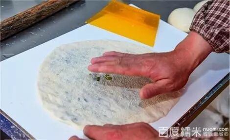 只见师傅麻利利拿出一团醒好的浅黄面墩,揉得圆圆的旋即又打扁,中间包上扎实的馅料,再捏紧成圆团,又重新擀抻成又大又薄的面饼,再匀匀抹上酱油,密密撒上芝麻,师傅一面把面饼从案板上取下,一面继续抻长抻大,整块面饼自如地在手中翻转。