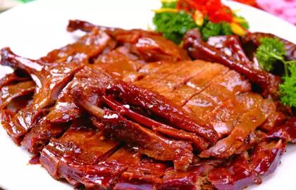 乐山甜皮鸭沿用的是清朝御膳工艺。由民间发掘、改进,卤水别具特色,色泽棕红、皮酥略甜、肉质细嫩、香气宜人。最正宗的甜皮鸭,必须选用农家喂养的麻鸭为原料,并且是用滚油一勺勺的淋熟,不是炸熟的。
