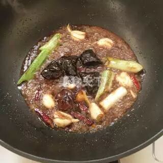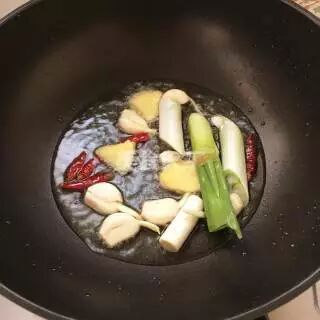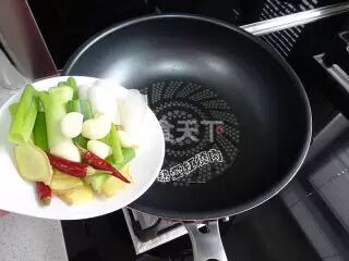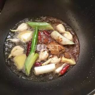 2、锅中稍放点油,放入葱姜、八角、桂皮、香叶、辣椒、冰糖翻炒
