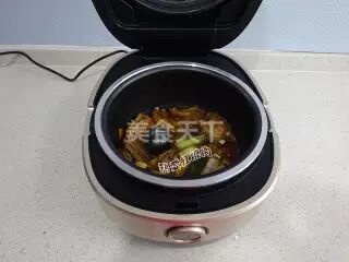 10、将锅里所有炒好的菜一起倒入电饭锅中,然后盖好盖儿,选择焖饭功能即可。