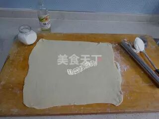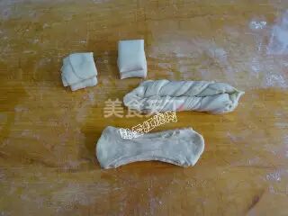 16、卷起来切偶数段,然后每两个摞起来按扁拉长再扭一下,每两个的两头捏在一起以免打开。