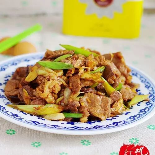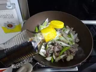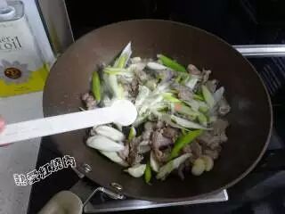 炒菜过程要动作快,急火爆炒才好吃,所以看到羊肉变色就加葱块,加完盐和酱油翻炒几下即可出锅,不要等葱变软,否则就不好吃了。