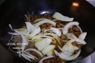 6. 待土豆表层熟了在倒入羊肉翻炒均匀。