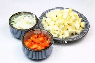 4、将土豆切块、胡萝卜切块、洋葱切丝备用。