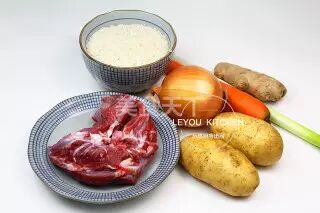羊腿肉1200克 生姜5片 土豆500克 枸杞50克 中药包一份 调料;调和油适量 食盐1勺 味精适量 什锦香料适量 孜然适量 料酒一勺 生抽半勺