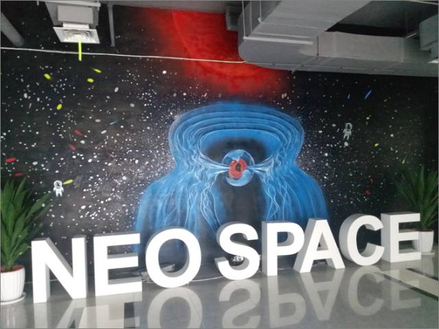在相关同学的指引下,我们来到了浙大最有创业氛围的基地——浙江大学紫金创业园空间。元空间(NEO SPACE)建成于2015年暑期,位于浙大紫金港校区月牙楼一楼,占地面积800平方左右。在基地外就能看到Neo Space的发展过程,显示着“大众创业、万众创新”的思想潮流。