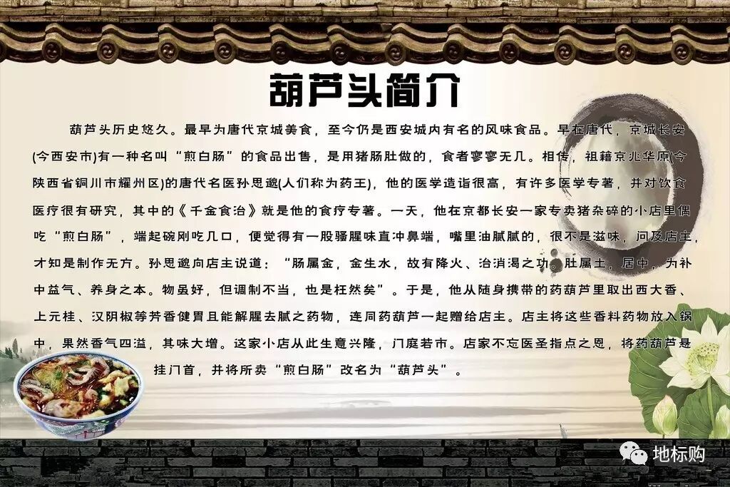 相传,唐代著名医学家孙思邈将烹制猪肠肚的方法传授给长安一家饮食店店主,并将一个药葫芦赠给店主调味。店主按照孙思邈的指点改进制作方法,长安"葫芦头"从此有名,千年流传。