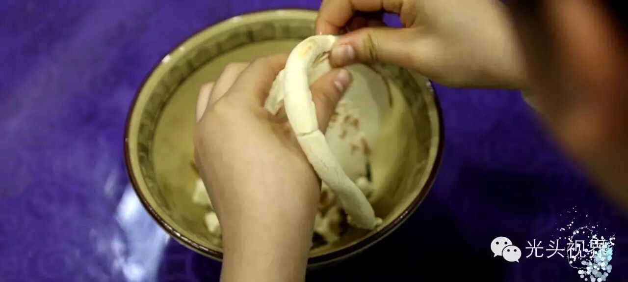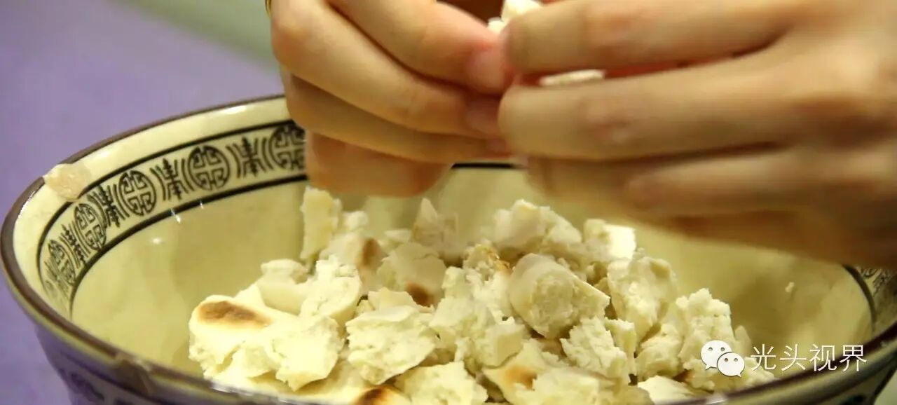 葫芦头所掰的馍块相对大一点。可以参考羊肉泡馍的掰法,将所有馍块掰成蚕豆大小即可;如果担心掰的大小不一,还可以沿着馍外围先掰下均匀粗细的一圈馍,然后再一点一点掰成小块。