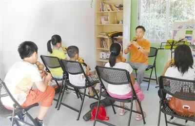 去年9月初,红旗中学退休校长甘广宗对社工小蔡说,希望社工组织一些想学的孩子开一个免费的葫芦丝班。9月13日,葫芦丝学习班开班,每周六下午练习,至今葫芦丝班已开17节课,甘老师从基础的乐理到简单曲子的练习教授孩子们。图为甘老师正在教孩子们吹葫芦丝。