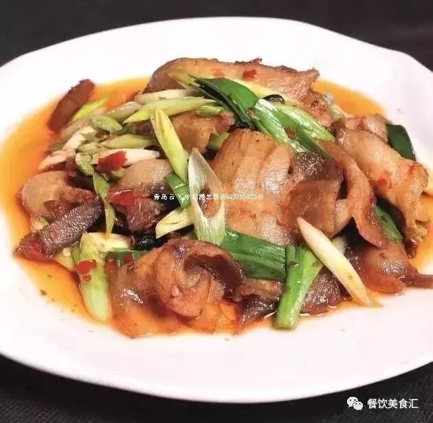 2、炒锅滑透,将肉片入锅煎至变色、卷曲,用小火炒成灯窝盏,倒入料汁炒匀炒香,下入蒜苗梗中火炒5-8秒,出锅前再下入蒜苗叶中火炒3-4秒,起锅入盘。