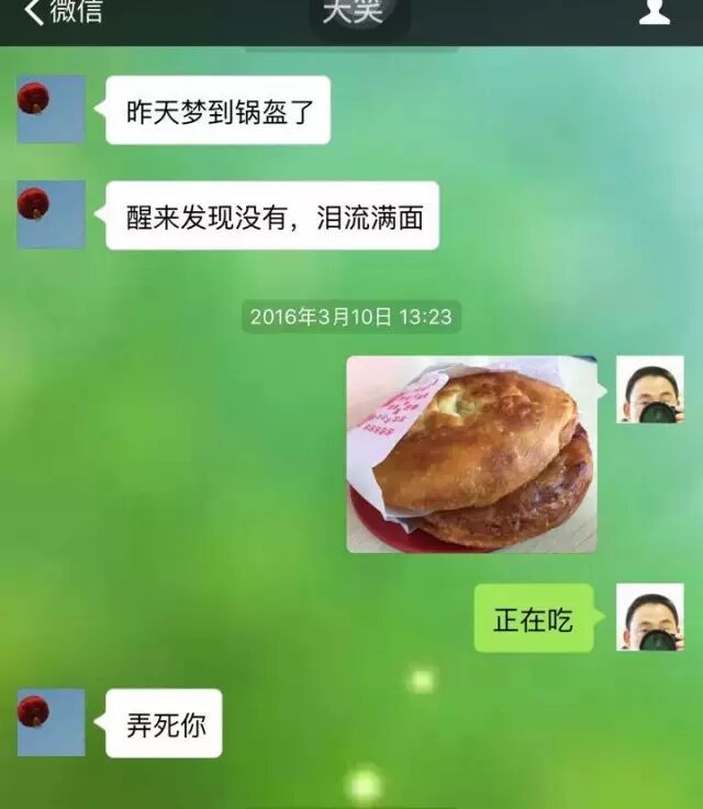 前几天,他微信又发来对锅魁单相思的消息,而我当时正在吃锅魁,随手发了张照片给他,顿时,点中了他的死穴。