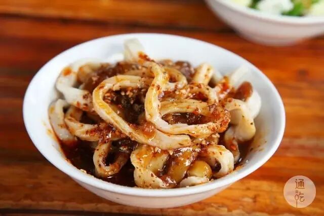 粉,必须是手工现出的红苕粉,锅魁,一定要现场煎得滋滋冒油。一口硬脆、一口软韧,一口椒盐、一口酸辣,想想都流口水吧?