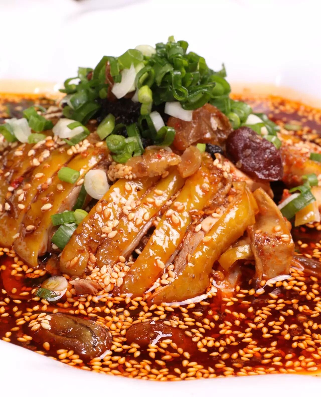 用盐焗鸡油调制卤水,卤好的鸡皮黄肉嫩,沙姜味浓;走菜时,鸡肉要用木板拍松,能够彻底吸收调料滋味,再淋上自制的五仁辣汁和芝麻红油,干果气息浓郁,麻香十足。