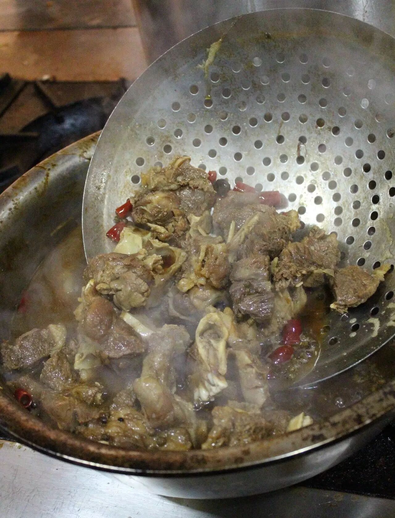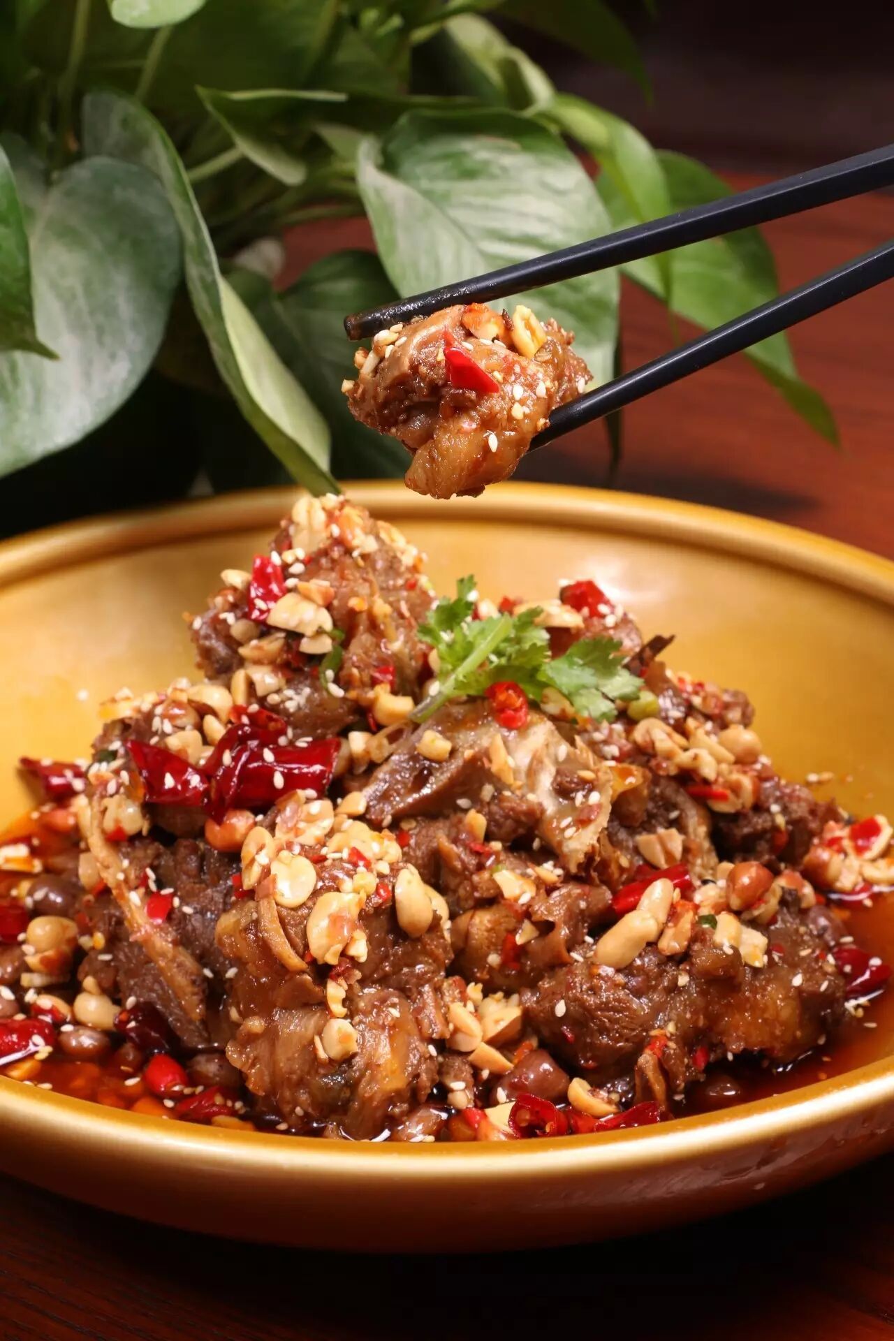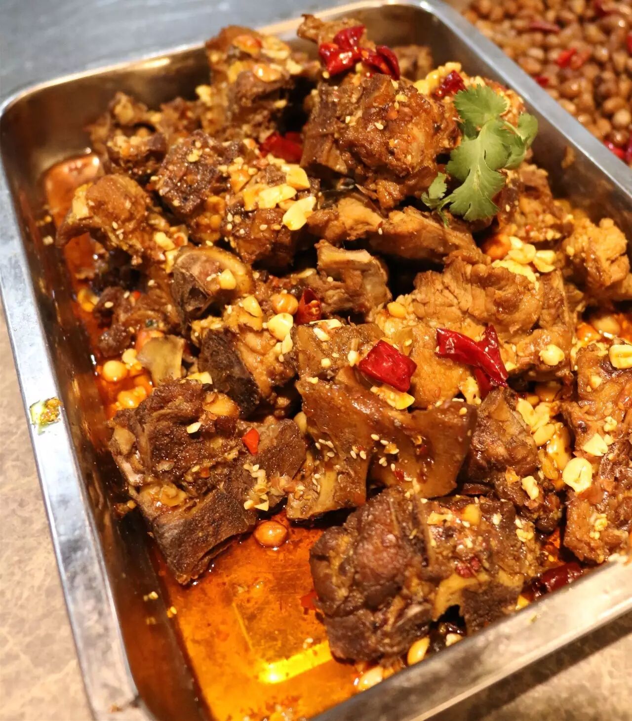 猪脊骨成本低,但整块入菜不便食用,将其砍成小块,既入味又好“下嘴”,每块骨头上都连着肉,食客非常享受这种“肉搏”的快感。除此之外,这款卤水和川式卤水相比有两个改良点:一,增加干二荆条辣椒和干红花椒的用量,只用少许甘草、八角、白蔻等增香,突出重麻重辣的口感;二,油卤中油和汤的用量比例为5:1,油分覆盖汤汁表层,既能保温又能防止香气挥发,成菜油重香浓。