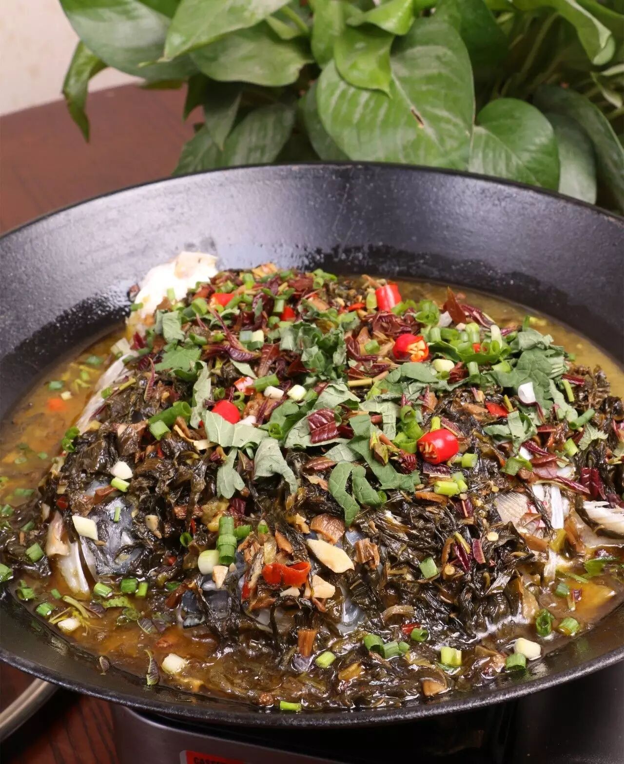 吊锅鱼头在餐厅有红汤和盐菜两个版本,红汤版本在后厨加工好,而盐菜版本则要提前炒好盐菜,带卡式炉一起走菜,现场堂做,气氛热烈。相较而言,盐菜版本的吊锅鱼头颜色清淡,但因剁椒、泡椒、盐菜的加入,口味香辣,带有一股独特的腌菜气息,所以更受欢迎,每天能卖60份左右。