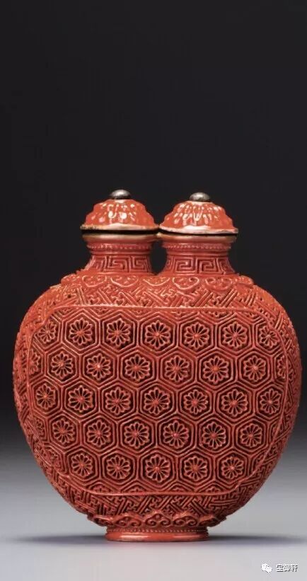 清嘉庆 矾红彩浮雕锦纹仿剔红双联鼻烟壶