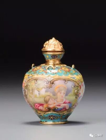 清乾隆 金胎北京画珐琅西洋母子图四系鼻烟壶