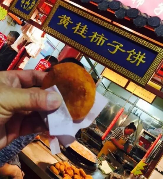 黄桂柿子饼,西安人最爱的小吃之一。柿子成熟的季节,取熟透的柿子,去皮去核,与面粉和匀,擀成皮,内包不同馅料成为不同口味的柿饼,有:核桃、芝麻、花生、玫瑰、豆沙、枣泥等等口味,包成乒乓球大小,压成小圆饼,放在平底油锅内煎熟。