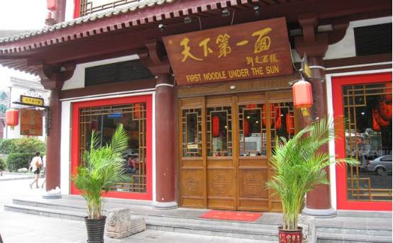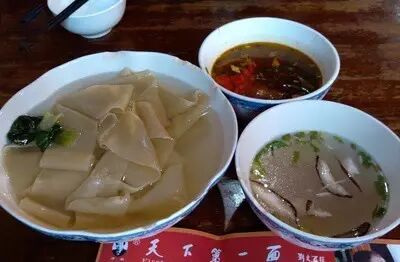 “天下第一面”,干嚼天下第一,它家位于天下第一的佛塔——大雁塔旁边。天下第一面也就是招牌面,共三个碗,一个碗装面,另外两个碗装汤料,一碗就一根宽面条据说是3.8米。