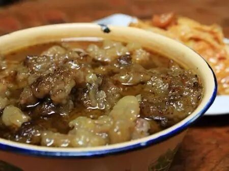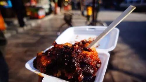 咬一口,滑嫩鲜香,完全不是用味精调制出来的味道。这时,再将肉汁浇到米饭上,再泼上这家的辣子油,淋上芝麻粒,味道香而不辣。肉和饭就着吃,一定吃到肚歪才能罢手。