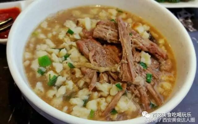 推荐理由:这家的羊肉泡馍就是典型的西安的羊肉泡馍;将馍掰成非常细碎的粒状,然后会上来汤,然后让你把掰好的馍放在汤里,这个汤非常好,里面的肉都是精瘦肉,看着不肥,但是汤非常香浓,而且羊肉非常松软,吃着粒粒的馍,嚼着牛肉,棒棒哒!