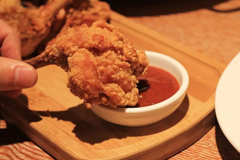 新鲜的嫩鸡小鸡腿,炸得酥脆多汁,⾁汁完美锁在表⽪中,沾上椒麻BBQ酱,尝起来些微麻,是经典又适合分享的小食。