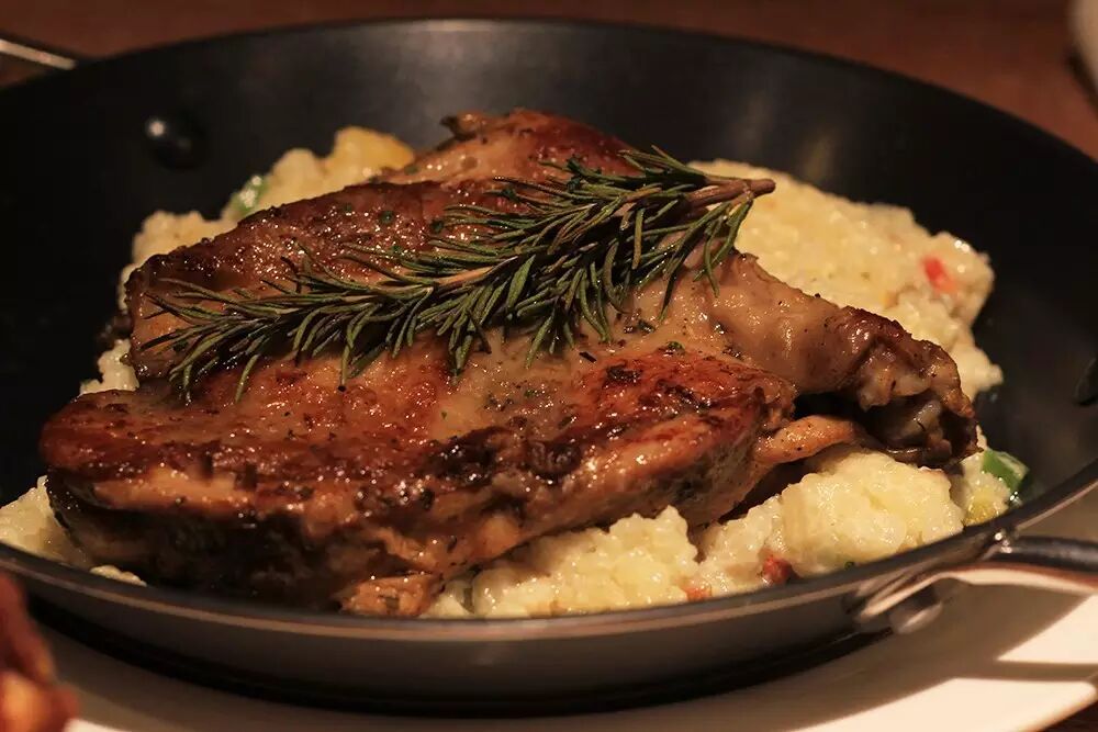 采⽤新鲜的嫩鸡肉搭配主厨秘制⾹草料腌制而成,还曾经夺下过上海50大黯然销魂饭之称的特制⾹料饭。