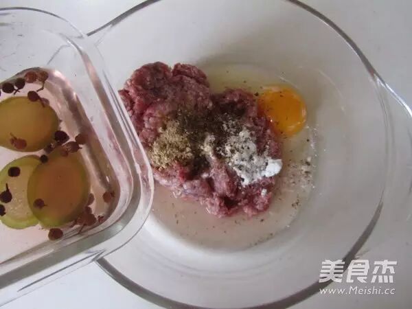 6.牛肉馅中加入鸡蛋、盐、少许淀粉和适量的花椒水,胡椒粉,顺着一个方向搅拌